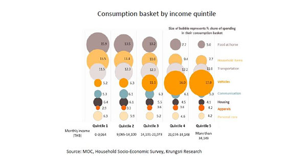 มาตรการบรรเทาความเดือดร้อนล่าสุดค่อนข้างเน้นการช่วยเหลือไปยังเฉพาะกลุ่มมากขึ้น และคาดว่าจะลดทอนผลกระทบได้บางส่วน เนื่องจากแรงกดดันจากแนวโน้มอัตราเงินเฟ้อที่ยังเพิ่มขึ้นในระดับสูง ตามราคาน้ำมันในตลาดโลกที่ได้รับผลกระทบจากความขัดแย้งรัสเซีย-ยูเครน รวมถึงราคาสินค้าในประเทศที่เตรียมจะปรับขึ้น อาทิ ราคาก๊าซหุงต้ม ค่าไฟฟ้าผันแปร ค่าเดินทางและขนส่ง และสินค้าอุปโภคบริโภค (บะหมี่สำเร็จรูป ผงซักฟอก) กอปรกับค่าเงินบาทที่ผันผวนในทิศทางอ่อนค่าซึ่งจะกระทบต่อราคาสินค้าวัตถุดิบนำเข้าและต้นทุนการผลิตเพิ่ม ทั้งนี้ ท่ามกลางหนี้ครัวเรือนที่อยู่ในระดับสูง กำลังซื้อของภาคครัวเรือนอ่อนแอและรายได้ที่แท้จริงลดลง ความแตกต่างของตะกร้าการบริโภคชี้ว่ากลุ่มผู้มีรายได้น้อยถึงปานกลางมีแนวโน้มที่จะได้รับผลกระทบหนักสุดจากราคาอาหารและการขนส่งที่สูงขึ้น เนื่องจากมีสัดส่วนค่าใช้จ่ายเพื่อการบริโภคในหมวดดังกล่าวสูง