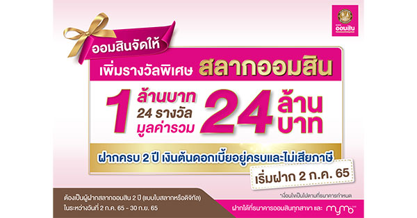 มิติหุ้น – นายวิทัย รัตนากร ผู้อำนวยการธนาคารออมสิน เปิดเผยว่า ธนาคารออมสินเปิดรับฝากสลากออมสิน งวดใหม่ ทั้งสลากออมสินพิเศษ 2 ปี (แบบใบสลาก) และสลากออมสินดิจิทัล 2 ปี เพื่อส่งเสริมการออมและตอบรับกระแสเรียกร้องจากแฟนพันธุ์แท้สลากออมสิน พร้อมกับเพิ่มรางวัลพิเศษ รางวัลละ 1 ล้านบาท จำนวน 24 รางวัล รวมเป็นเงิน 24 ล้านบาท สำหรับผู้ที่ฝากสลากออมสินตั้งแต่วันที่ 2 กรกฎาคม ถึง 30 กันยายน 2565 ซึ่งกำหนดออกรางวัลพิเศษทุกวันที่ 1 ของเดือน รวม 3 ครั้ง โดยแบ่งการออกรางวัลในเดือนสิงหาคม 6 รางวัล กันยายน 8 รางวัล และ ตุลาคม อีก 10 รางวัล ตามลำดับ โดยผู้สนใจสามารถฝากได้ 2 ช่องทาง คือ ธนาคารออมสินทุกสาขาทั่วประเทศ และ ฝากผ่านแอป MyMo ซึ่งมีความสะดวกอย่างมาก