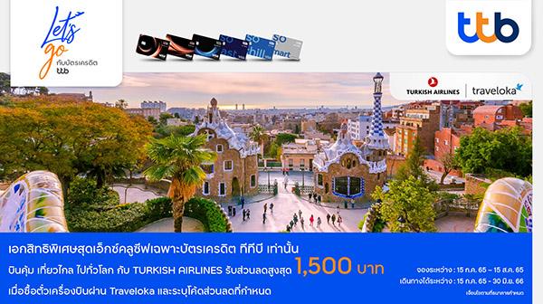 มิติหุ้น  –  บัตรเครดิต ทีทีบี ร่วมกับ Traveloka และสายการบิน Turkish Airlines จัดแคมเปญ “เที่ยวทั่วโลก รับส่วนลดสุดคุ้ม” มอบเอกสิทธิพิเศษสำหรับผู้ถือบัตรเครดิต ทีทีบี บัตรเครดิต ทีเอ็มบี และบัตรเครดิต ธนชาต รับส่วนลดพิเศษสูงสุด 1,500 บาท เมื่อสำรองบัตรโดยสารทุกเส้นทางของสายการบิน Turkish Airlines ผ่าน Traveloka ด้วยโค้ด TTBTURKISH เพื่อรับส่วนลด 20% สูงสุด 1,000 บาท และโค้ด TTBTK เพื่อรับส่วนลดเพิ่ม 500 บาท