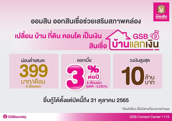 สินเชื่อ GSB บ้านแลกเงิน เป็นสินเชื่ออเนกประสงค์ที่เปิดกว้างสำหรับวัตถุประสงค์ในการขอกู้ ให้วงเงินกู้ไม่เกินรายละ 10 ล้านบาท สามารถใช้หลักทรัพย์ที่ปลอดจำนองมาเป็นหลักประกันได้ ทั้งที่ดินพร้อมสิ่งปลูกสร้าง / ห้องชุด (คอนโดมีเนียม) และที่ดิน ธนาคารให้กู้ไม่เกิน 90% /85% และ 60% ของราคาประเมิน ตามลำดับ คิดอัตราดอกเบี้ย 6 เดือนแรก อยู่ที่ 3.00% ต่อปี (MRR-3.245%) หรือคิดเป็นเงินงวดผ่อนต่ำใน 6 เดือนแรก เพียงแสนละ 399 บาทต่อเดือนเท่านั้น เดือนที่ 7-24 เท่ากับ MRR–1.955% (กรณีทำประกันชีวิตเพื่อคุ้มครองวงเงินสินเชื่อ) หรือ MRR-1.455% (กรณีไม่ทำประกันชีวิตเพื่อคุ้มครองวงเงินสินเชื่อ) และ ปีที่ 3 เป็นต้นไป MRR–0.50% หรือคิดเป็นดอกเบี้ยเฉลี่ย 3 ปี ต่ำสุดที่ 4.560% (ปัจจุบัน MRR ธนาคารออมสิน = 6.245%)