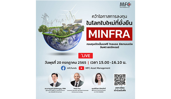 ทั้งนี้ บริษัทหลักทรัพย์จัดการกองทุน เอ็มเอฟซี จำกัด (มหาชน) หรือ MFC จะจัดงานสัมมนา “คว้าโอกาสการลงทุนในโลกใบใหม่ที่ยั่งยืน กับกองทุน MINFRA” ในวันพุธที่ 20 กรกฎาคม 2565 เวลา 15.00 – 16.10 น. โดยมี ดร.ชาญวุฒิ รุ่งแสงมนูญ, FRM ผู้ช่วยกรรมการผู้จัดการ กองทุนต่างประเทศ บลจ. เอ็มเอฟซี จำกัด (มหาชน) บรรยายในหัวข้อ “Why invest in Global Sustainable Infrastructure?” และคุณ Peter Fox, Investment Specialist, KBI Global Sustainable Infrastructure Strategy ร่วมให้ข้อมูลในหัวข้อ ‘ลักษณะเด่นของ KBIGI Global Sustainable Infrastructure ที่ตอบโจทย์ในการลงทุน’ รวมไปถึงเรื่องของแนวโน้มตลาด โอกาสการเติบโต และธุรกิจที่น่าสนใจในการลงทุน โดยงานสัมมนาดังกล่าวสามารถรับชมได้ผ่านระบบ Facebook: https://www.facebook.com/mfcfunds และ Youtube: https://www.youtube.com/c/MFCAssetManagementPLC ของ MFC