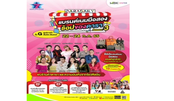 มิติหุ้น – ศูนย์การค้าเอ็ม บี เค เซ็นเตอร์ ร่วมกับ บริษัท เซเว่น สตาร์ สตูดิโอ จำกัด และ DARADAILY ชวนเหล่าแฟชั่นนิสต้ามาเดินชมเดินช้อปสินค้าแบรนด์เนมคุณภาพดีราคาถูกใจในงาน แบรนด์เนมมือสอง ช้อปของดารา Season 3 ของแท้ถูกชัวร์ รับประกันโดยสถาบันสอนดูกระเป๋าแบรนด์เนมที่แรกในไทย TCF (The Catch Fake Brandname) ระหว่างวันศุกร์ที่ 22 กรกฎาคม – วันอาทิตย์ที่ 24 กรกฎาคม 2565