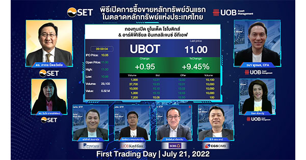 มิติหุ้น – ภากร ปีตธวัชชัย กรรมการและผู้จัดการ รินใจ ชาครพิพัฒน์ รองผู้จัดการ หัวหน้าสายงานการตลาด ตลาดหลักทรัพย์แห่งประเทศไทย พร้อมด้วย วนา พูลผล ประธานเจ้าหน้าที่บริหาร บลจ. ยูโอบี (ประเทศไทย) ร่วมเปิดการซื้อขายหลักทรัพย์วันแรกในตลาดหลักทรัพย์แห่งประเทศไทยของ “กองทุนเปิด ยูไนเต็ด โรโบติกส์ & อาร์ติฟิเชียล อินเทลลิเจนซ์ อีทีเอฟ” ซึ่งเป็นกองทุน Thematic ETF ที่เปิดโอกาสการลงทุนในอุตสาหกรรม Robotics และ AI ทั่วโลก ในวันที่ 21 ก.ค. 2565 โดยใช้ชื่อย่อในการซื้อขายหลักทรัพย์ว่า “UBOT” ผู้ลงทุนดูข้อมูลเพิ่มเติมได้ที่ www.uobam.co.th หรือศึกษาข้อมูล ETF เพิ่มเติมได้ที่ www.setinvestnow.com/ETF