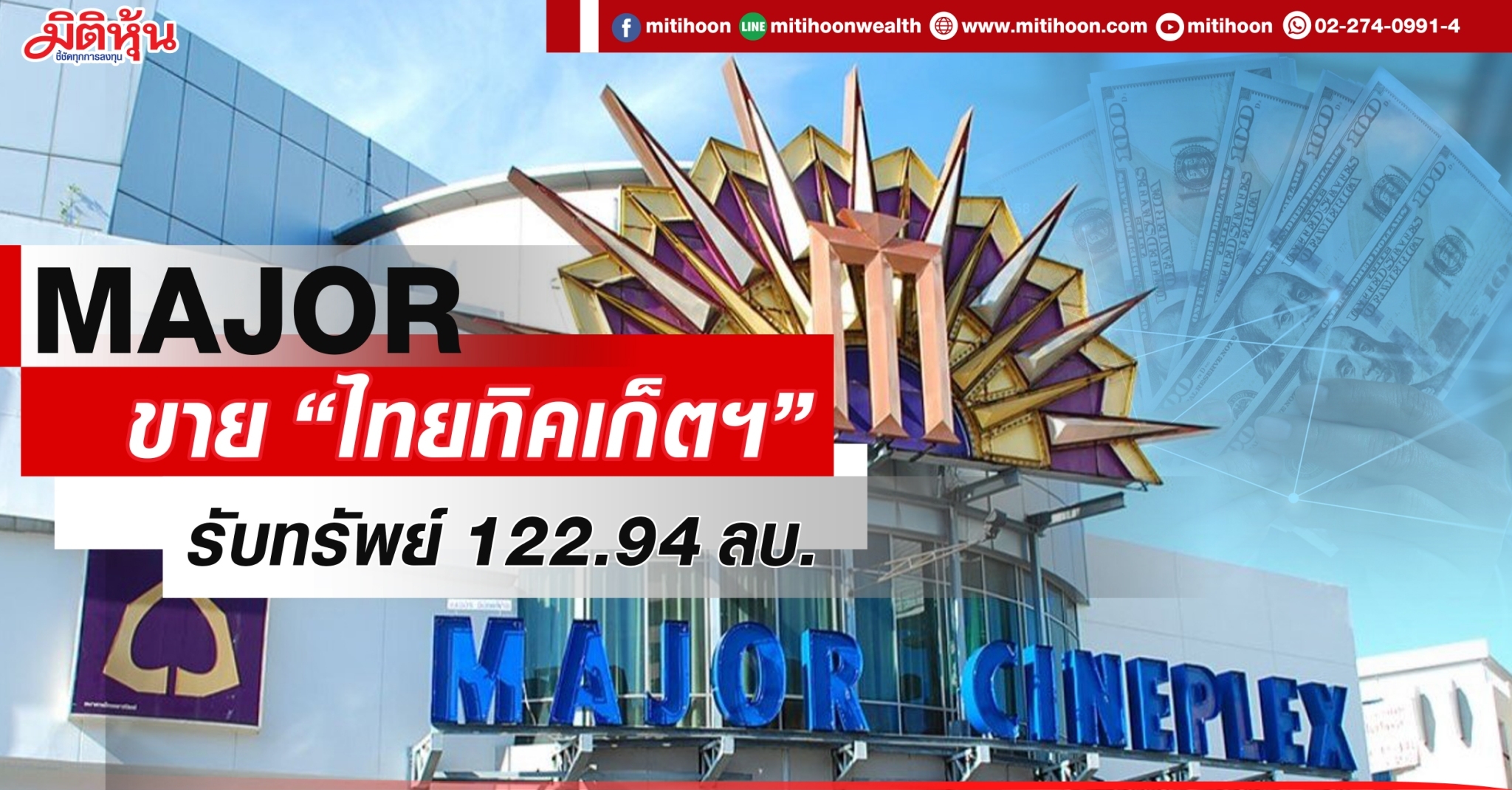 มิติหุ้น-MAJOR แจ้งมติบอร์ด อนุมัติ ให้ขายหุ้นที่ถือใน บริษัท ไทยทิคเก็ตเมเจอร์ จำกัด จำนวน 2 แสนหุ้น หรือในสัดส่วน 20% ในราคาหุ้นละ 614.70 บาท คิดเป็นมูลค่ารวม 122.94 ลบ. โดยขายให้กับ TICKETMASTER EUROPE HOLDCO LTD.