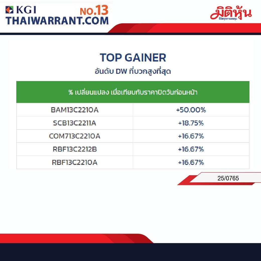 มิติร้อน TOP GAINER DW13 25 กรกฎาคม 2022 / เวลา 11:30 น. 31 ติดตามข้อมูลเพิ่มเติมได้ที่ https://www.thaiwarrant.com/topvolume