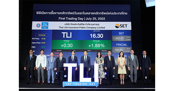 มิติหุ้น – บริษัท ไทยประกันชีวิต จำกัด (มหาชน) ‘ไทยประกันชีวิต’ ส่งหุ้น TLI เข้าซื้อขายในตลาดหลักทรัพย์แห่งประเทศไทย (ตลาดหลักทรัพย์ฯ) เป็นวันแรกในวันที่ 25 กรกฎาคม 2565 โดยใช้ชื่อย่อในการซื้อขายหลักทรัพย์ (Ticker) ว่า ‘TLI’ ด้วยราคา IPO ที่ 16.00 บาทต่อหุ้น คิดเป็นมูลค่าเสนอขายรวมประมาณ 37,067 ล้านบาท (รวมการจัดสรรหุ้นส่วนเกิน) นับเป็น IPO ที่มีมูลค่าเสนอขายสูงที่สุดในตลาดหลักทรัพย์ฯ ในปี 2565 และเป็น IPO ของหุ้นในหมวดธุรกิจประกันภัยและประกันชีวิตที่มีมูลค่าเสนอขายสูงที่สุดในประวัติศาสตร์ตลาดทุนไทย รวมทั้งยังมีมูลค่าเสนอขายสูงที่สุดสูงในหมวดธุรกิจประกันภัยและประกันชีวิตของภูมิภาคเอเชียตะวันออกเฉียงใต้นับจากปี 2543 และมีโอกาสที่จะได้รับการจัดเข้าไปรวมอยู่ในดัชนี SET50 และ SET100 ด้วยเกณฑ์ Fast-Track ภายใน 3 วันทำการนับจากวันที่หุ้นของ TLI เข้าทำการซื้อขายในตลาดหลักทรัพย์ฯ
