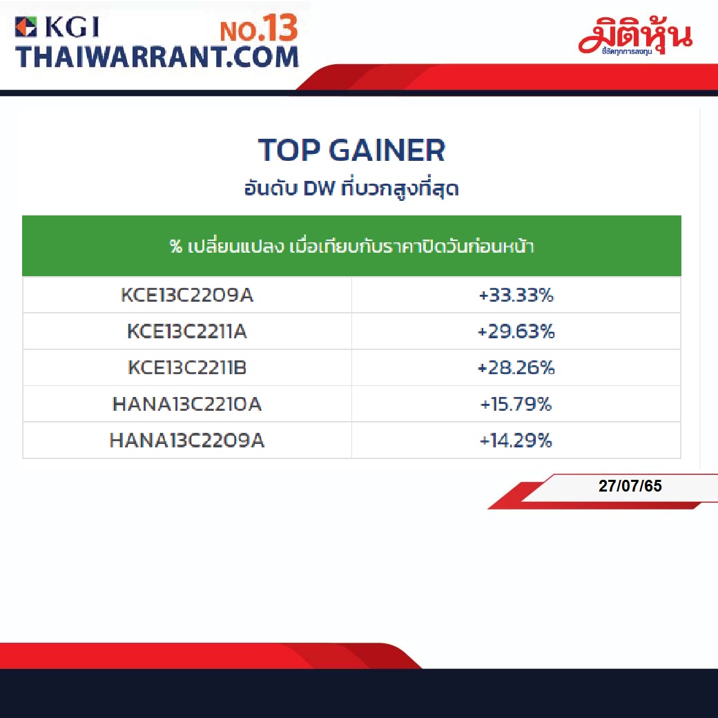 มิติร้อน TOP GAINER DW13 27 กรกฎาคม 2022 / เวลา 11:31 น. 48 ติดตามข้อมูลเพิ่มเติมได้ที่ https://www.thaiwarrant.com/topvolume