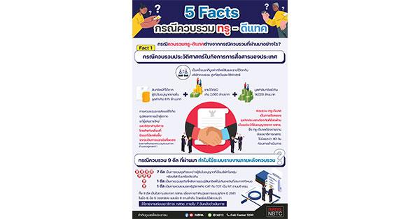 ทั้งนี้ เพื่อคลายข้อสงสัยและสื่อสารกับสาธารณะบนหลักฐานและข้อเท็จจริง สำนักงาน กสทช. จึงได้จัดทำข้อมูลในรูปแบบ Infographics ภายใต้หัวเรื่อง “5 Facts กรณีควบรวมทรู-ดีแทค” และเผยแพร่ผ่านช่องทางการสื่อสารต่างๆ โดยมีรายละเอียดโดยสังเขปดังต่อไปนี้