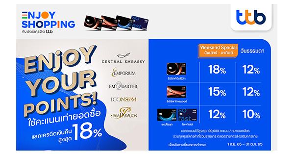 บัตรเครดิต ทีทีบี รีเซิร์ฟ อินฟินิท รับเครดิตเงินคืน 18% ในวันเสาร์–อาทิตย์ และ 12% ในวันจันทร์–ศุกร์ บัตรเครดิต ทีทีบี รีเซิร์ฟ ซิกเนเจอร์ รับเครดิตเงินคืน 15% ในวันเสาร์–อาทิตย์ และรับ 12% ในวันจันทร์–ศุกร์ สำหรับบัตรเครดิต ทีทีบี บัตรเครดิต ทีเอ็มบี และบัตรเครดิต ธนชาต ที่มีคะแนนสะสม รับเครดิตเงินคืน 12% ในวันเสาร์–อาทิตย์ และ 10% ในวันจันทร์–ศุกร์ จำกัดการแลกคะแนนสูงสุด 100,000 คะแนน / หมายเลขบัตรหลัก รวมทุกศูนย์การค้าที่ร่วมรายการ ตลอดรายการส่งเสริมการขาย โดยนำบัตรเครดิตและเซลล์สลิปที่มียอดซื้อสินค้ามาลงทะเบียน ณ จุดลงทะเบียนแต่ละศูนย์การค้า ภายในวันที่ซื้อสินค้า