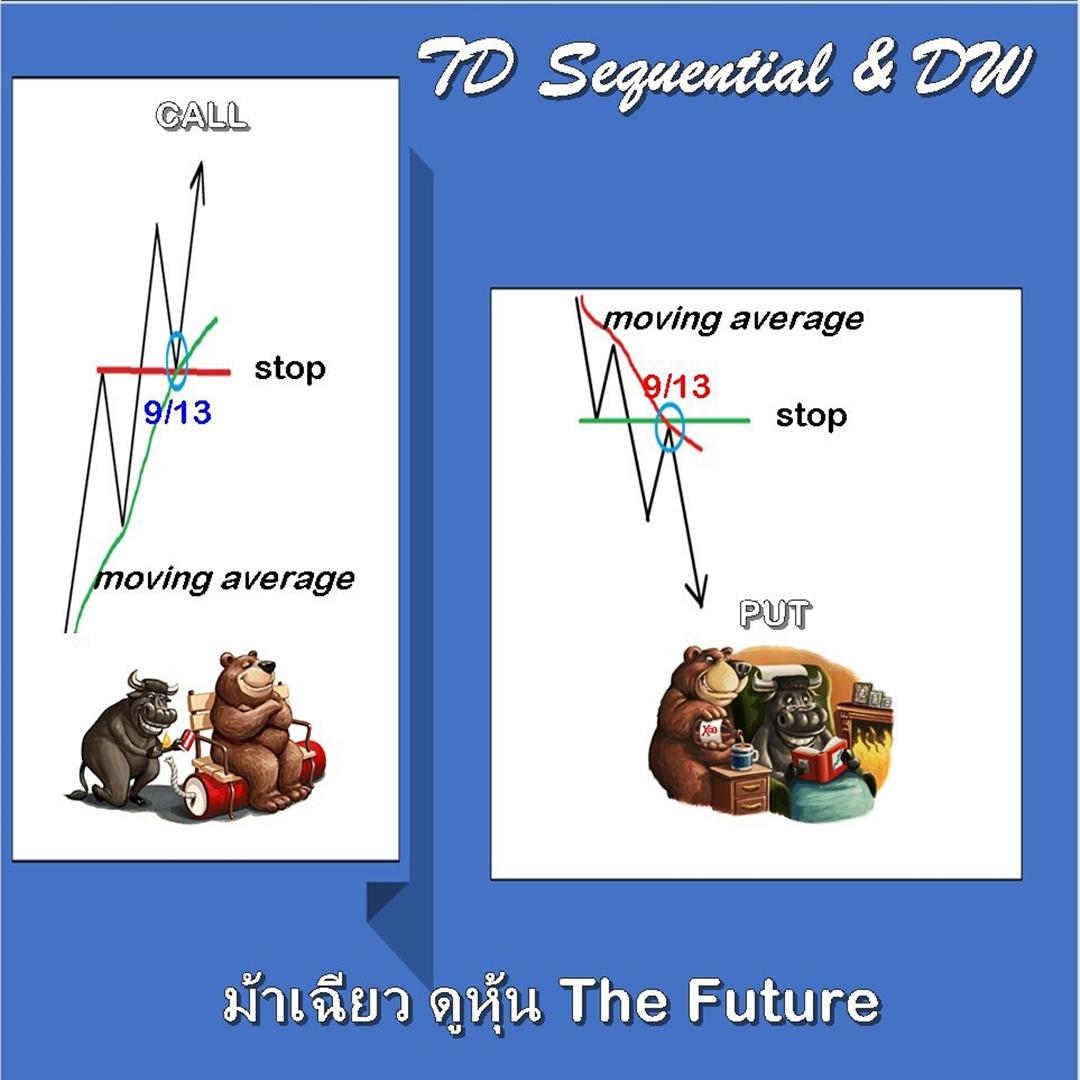 เช่น จากภาพ เราจะ Long/Call ในแนวโน้มขึ้นที่ลงมาพักตัว และการพักตัวจบลงจากสัญญาณ TD 9/13
