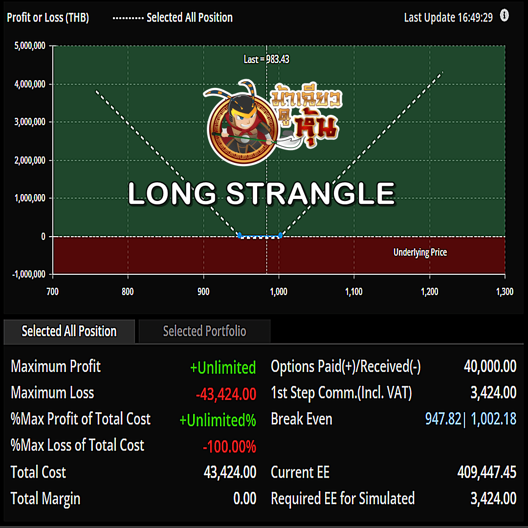 Long Strangle คือ การซื้อ (Long) put option ในราคาใช้สิทธิที่ต่ำ และซื้อ (Long) call option ในราคาใช้สิทธิที่สูง