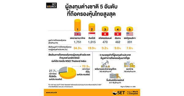 นักลงทุนต่างประเทศที่มีมูลค่าการถือครองหุ้นสูงสุด 10 สัญชาติแรก พบว่า 8 ใน 10 สัญชาติ เป็นสัญชาติเดียวกันกับปีก่อน แต่มีสลับอันดับ โดย นักลงทุนจากสหราชอาณาจักรมีมูลค่าการถือครองหุ้นสูงสุด ตามมาด้วยนักลงทุนจากสิงคโปร์ และสวิสเซอร์แลนด์ที่ขยับขึ้นมาอยู่ที่อันดับ 3 ขณะที่ฮ่องกงลดลงไปอยู่อันดับ 4 และสหรัฐอเมริกา ญี่ปุ่น มอริเชียส เนเธอร์แลนด์ ฝรั่งเศส และบริติช เวอร์จิน ไอส์แลนด์ ตามลำดับ