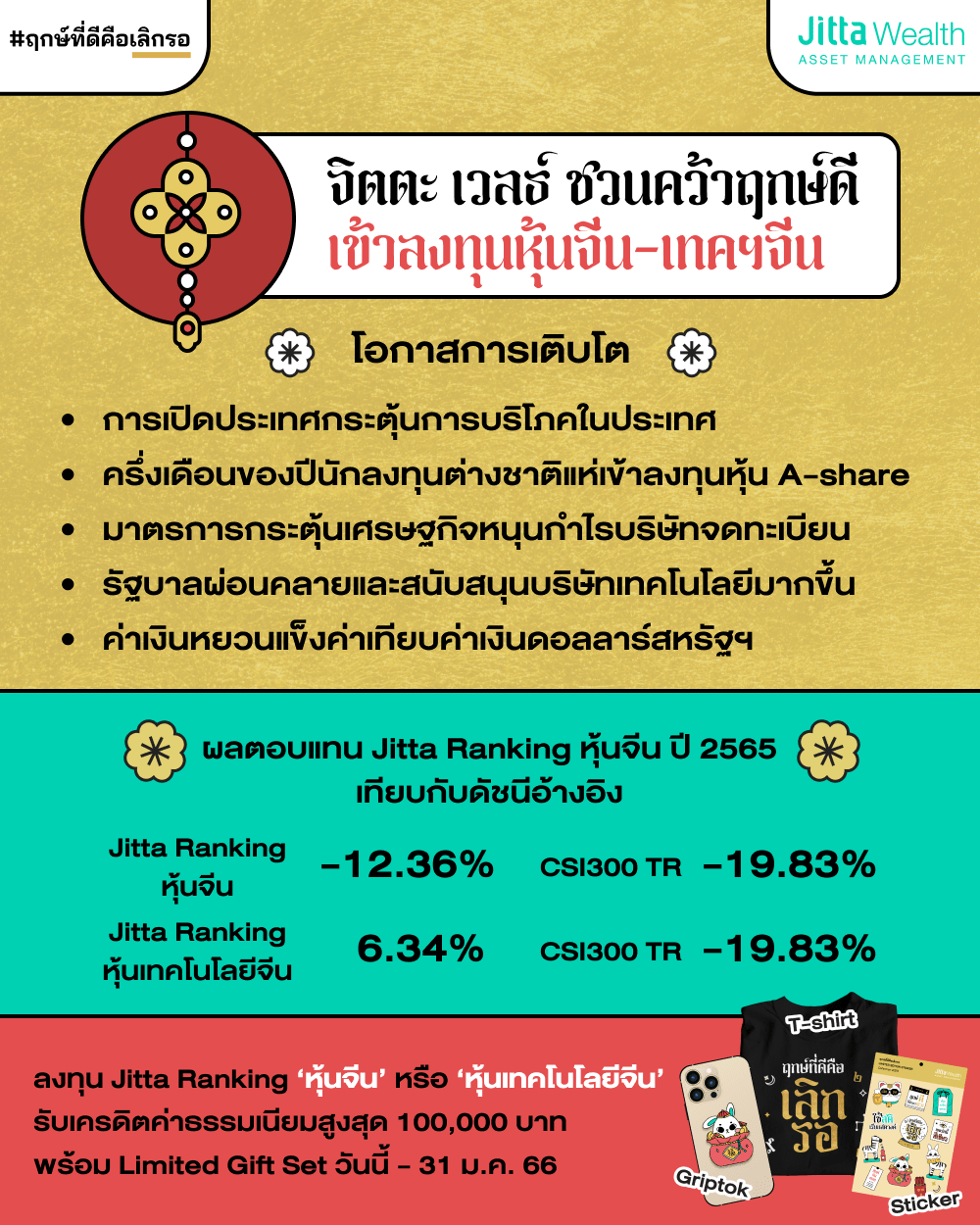 จิตตะ เวลธ์ จึงอยากชวนนักลงทุน ‘เลิกรอ’ แล้วคว้าฤกษ์ดีกับโอกาสลงทุนในหุ้นจีนและหุ้นเทคโนโลยีจีนเพื่อรับการเติบโตอย่างแข็งแกร่งของเศรษฐกิจจีนภายหลังการเปิดประเทศ ผ่านกองทุนส่วนบุคคล Jitta Ranking หุ้นจีนและกองทุนส่วนบุคคล Jitta Ranking หุ้นเทคโนโลยีจีน ด้วยโปรโมชั่นเพิ่มความเฮง เสริมความปังรับตรุษจีน โดยนักลงทุนที่ลงทุนหรือเพิ่มทุนในแผนการลงทุนดังกล่าวทุกๆ 50,000 บาท รับเครดิตค่าธรรมเนียม 250 บาท สูงสุด 100,000 บาท พิเศษ! รับชุดของขวัญตรุษจีนไปเสริมความปังทั้ง Griptok เสื้อยืด และ Sticker Limited Edition ภายในวันที่ 31 มกราคม 2566 เท่านั้น