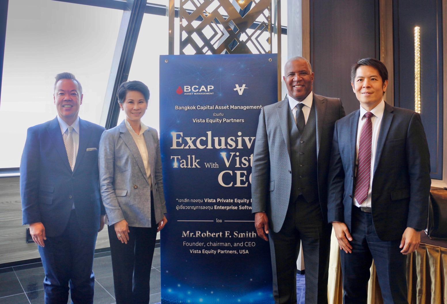 นางเมธ์วดี ประเสริฐสินธนา กรรมการผู้จัดการ และ ดร.ธนาวุฒิ พรโรจนางกูร รองกรรมการผู้จัดการและหัวหน้าสายงานบริหารการลงทุน (CIO) บริษัทหลักทรัพย์จัดการกองทุน (บลจ.) บางกอกแคปปิตอล หรือ BCAP ได้ร่วมต้อนรับ นักลงทุนสถาบันและนักลงทุนรายบุคคล เข้าร่วมงาน Exclusive talk with Vista CEO ร่วมพูดคุยเจาะลึกความสำเร็จของ Vista Equity Partners ผู้บริหารกองทุน Enterprise Software Private Equity ที่เน้นลงทุนในบริษัท Software สำหรับบริษัทขนาดใหญ่ โดย Mr. Robert F. Smith ผู้ก่อตั้งและ CEO Vista Equity Partners